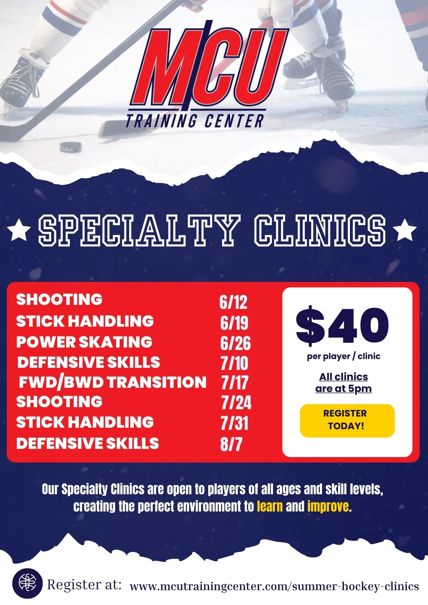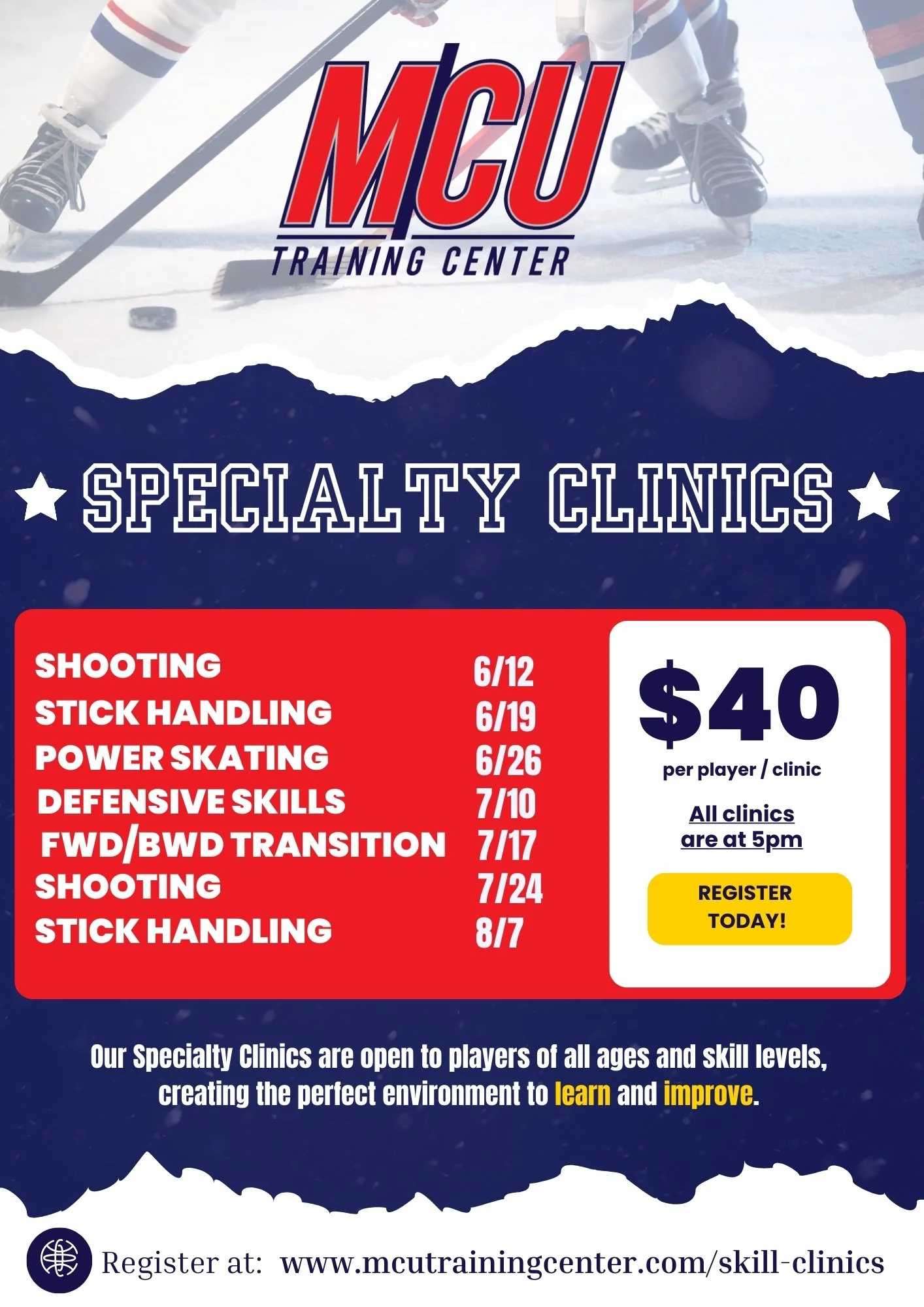 From beginners to pro, MCU Training Center is a one stop shop to improve your game. We brought in the top local trainers and their knowledge, skills and training to develop programs that will make you a better player no matter your skill level. Our small player-to-coach ratio clinics allow us to focus on each individual athlete’s needs.